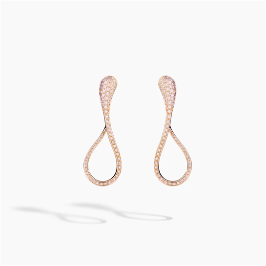 Orecchini Elika nella versione media, con modulo ispirato al volo elicoidale del seme dell’acero e interamente rivestito da pavé di diamanti. La lunghezza da 5 cm disegna il viso con una linea grafica e leggera.