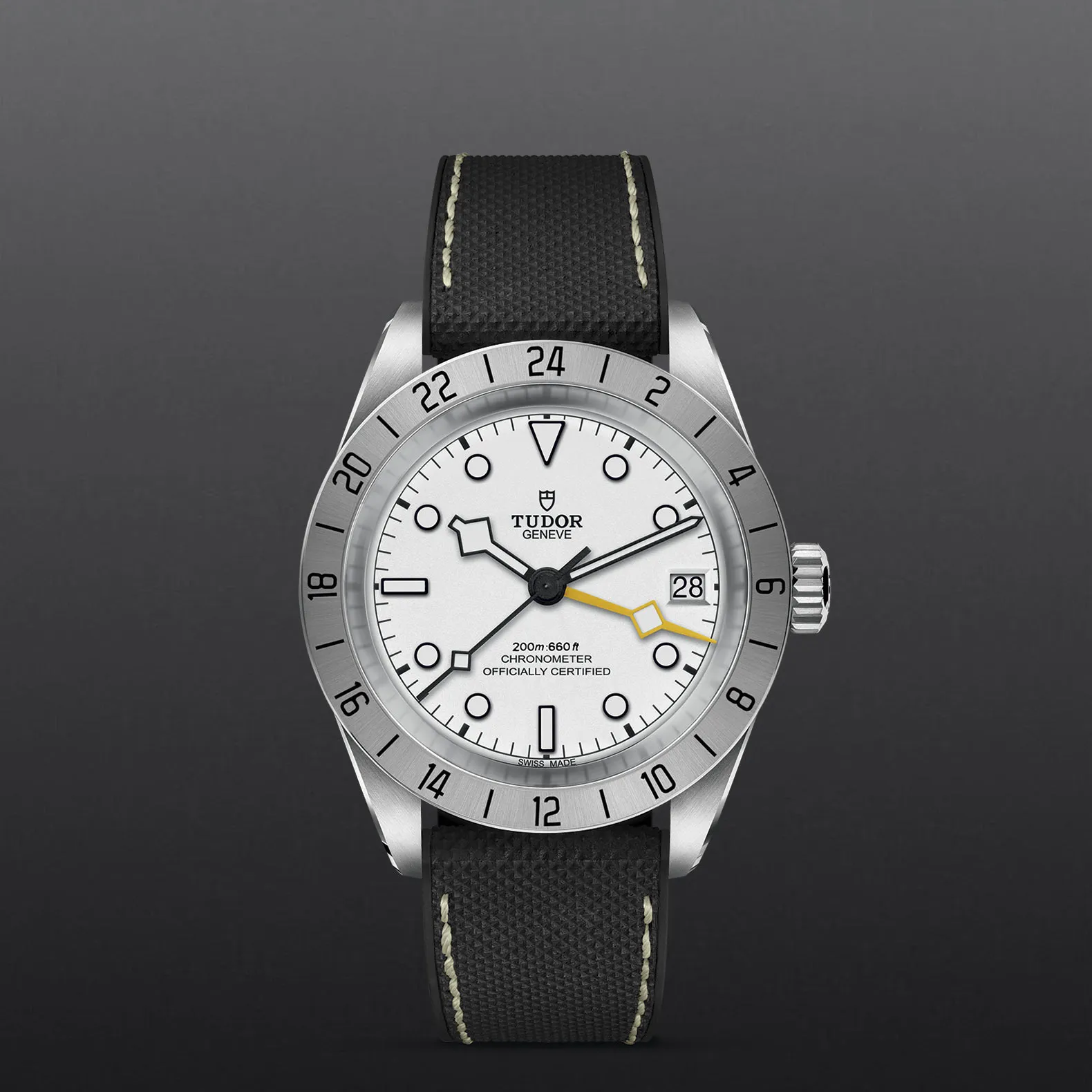 Il Black Bay Pro è un modello interamente nuovo dotato di doppio fuso orario, una complicazione tecnica che permette di visualizzare l’ora locale senza perdere di vista l’ora di un altro fuso orario. Compatto, robusto e sportivo, questo modello presenta numerosi dettagli estetici unici e celebra lo spirito degli orologi tecnici che TUDOR ha prodotto per i professionisti nel corso della sua storia. Riconoscibile grazie alla lunetta fissa satinata graduata 24 ore e alla lancetta “Snowflake” 24 ore di colore giallo, il Black Bay Pro è animato dal Calibro di Manifattura TUDOR MT5652 con funzione GMT integrata.
